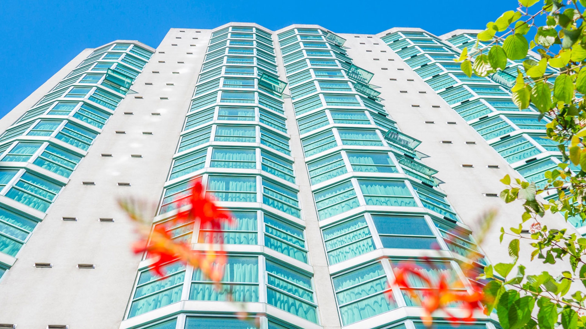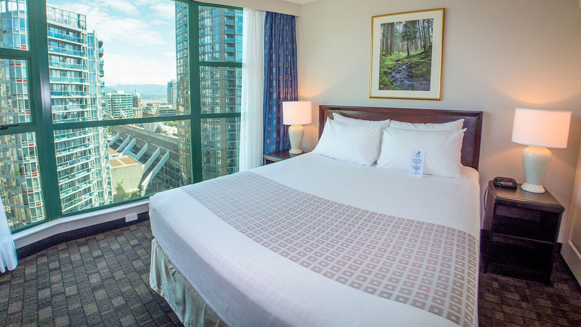 Each of the two bedrooms has one queen bed and floor-to-ceiling windows. Also features a sofa bed and flat screen television in the separate living room and a fully-equipped galley kitchen.